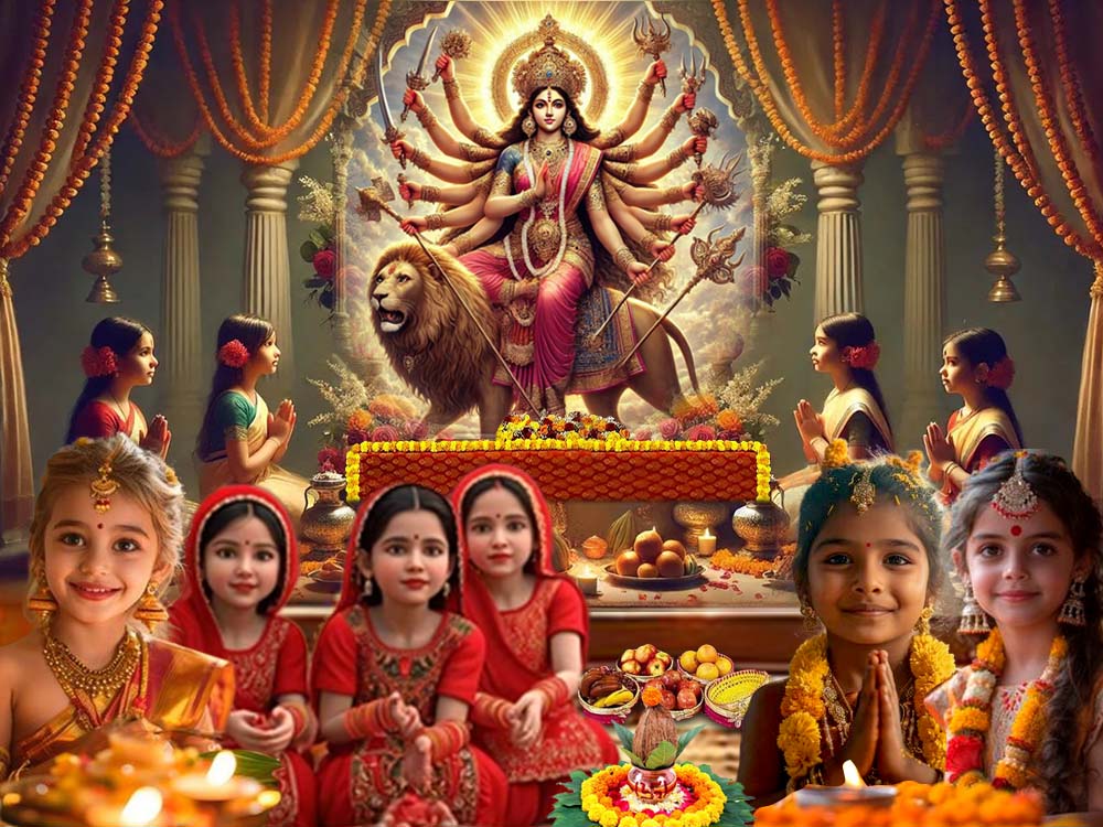 Kanya Pujan is observed on the eighth or ninth day of Navratri, known as "Ashtami" or "Navami," and it involves the worship of young girls as forms of Goddess Durga. This ritual symbolizes the recognition of the divine feminine energy and the belief that young girls are pure and sacred. During Kanya Pujan, girls up to the age of ten years (below the age of puberty) are invited, seated on a pedestal, their feet washed and they are applied Kumkum and a kalawa(sacred thread) is tied around their wrists. They are offered food consisting of poori(a kind of bread), chana(gram) and halwa(sweet dessert), some money and gifts. Finally, their blessings are sought by touching their feet. It is believed that the 9 girls represent the nine manifestation of Goddess Durga and the ritual of Kanya Pujan pleases Goddess Durga who blesses the devotee. In Vedic culture small girls are considered divine-like because of their innocence, unconditional love and purity. As per Devi Bhagwat Purana, worshipping small girls on the ninth day of Navratri blesses a devotee with divine grace of the Devi. According to Skanda Purana, 2-year-old girl represent Kumari, 3-year-old girl - Trimurti, 4-year-old girl - Kalyani, 5-year-old girl - Rohini, 6-year-old girl - Kalika, 7-Year-old girl - Chandika, 8-year-old girl - Shambhavi and 9-year-old girl is considered the form of Maa Durga. A girl of 10 years of age represents Subhadra. During Kanya Pujan, a little boy is also invited who represents Lord Batuk Bhairav, the keeper of every Shaktipeeth. It is believed that by doing Kanya Pujan the full fruits of Navratri worship are attained.